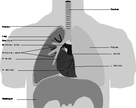 Este format din: (1) nas, gura si faringe, (2) laringe, (3) trahee, (4) bronhii; acestea formeaza impreuna caile respiratorii. (5) Alveolele si ductele alveolare care le leaga de cele ultimele ramificatii ale bronhiolelor formeaza tesutul pulmonar (6), care este invelit de (7) pleura. Tot acest intreg este controlat de centrul respirator (8).