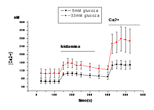 Expunerea celulelor endoteliale la 33mM D-glucoza timp de 6 zile duce la cresterea calciului liber citosolic comparativ cu celulele crescute in conditii normale de glucoza (5mM). Astfel, in absenta Ca2+ extracelular, concentatia bazala de calciu in celulele tratate cu 33mM glucoza este de 106.75 nM in timp ce in celulele control este de 66.88 nM, valori ce sunt stabile in timp (Figura 1, A).