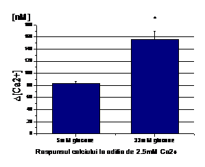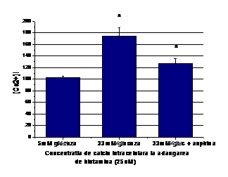 Aditia histaminei (25 mM) induce o crestere tranzienta a [Ca2+]i in ambele conditii (5 si 33mM glucoza), care in timp, scade la o valoare de platou fara sa atinga insa nivelul bazal (Figura 1). Crestera maxima a [Ca2+]i ca raspuns la histamina este mai mare in celulele expuse la 33mM glucoza fata de control (~163.5 vs. ~99.75nM, Figura 1,B). Dupa cum se observa in figura 1, aditia ulterioara de calciu extracelular duce la o crestere a calciului care intra in celule, care este mai mare in celulele crescute in 33mM glucoza (~266.45 nM) decat in celulele control (~148.5 nM, Figura 1,C ).
