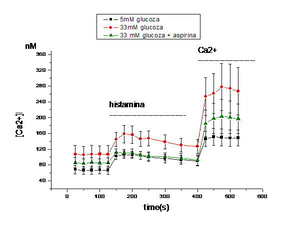 Rezultatele noastre demonstreaza ca atat eliberarea calciului intracelular din stocurile intracelulare (ca raspuns la histamina) cat si intrarea calciului extracelular in celula, sunt modificate in urma expunerii celulelor endoteliale la concentratie crescuta de glucoza. Tratarea cu aspirina a celulelor activate de glucoza produce restabilirea semnalizarii calciului.