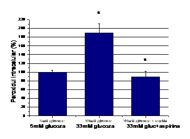 Nivelele crescute de glucoza sunt asociate cu un nivel crescut al stresului oxidativ, inlustrat in producere crescuta a speciilor reactive de oxigen. Disfuctiile celulei in conditii hiperglicemice sunt datorate in principal nivelelor crescute ale speciilor reactive de oxigen. Pentru a afla mecanismele implicate in efectele favorabile ale aspirinei (de a imbunatati homeostazia calciului si a creste productia de NO) am urmarit efectul acesteia asupra speciilor reactive de oxigen. Expunerea cronica a celulelor endoteliale la glucoza crescuta induce cresterea dramatica a nivelului speciilor reactive de oxigen, determinate cu ajutorul fluoroforului DCFH-DA. Nivelul anionii supeoxizi de oxigen eliberati in mediul de cultura de CE activate de glucoza este mult crescut, comparativ cu cel din celulele control. Aspirina reduce stresul oxidativ indus de glucoza la nivelul celulelor control (crescute in conditii normale de glucoza).