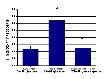Rezultatele experimentelor arata ca incubarea celulelor crescute in 33mM glucoza cu 1mM aspirina timp de 48 ore reduce speciile reactive de oxigen induse de concentratia crescuta de glucoza.