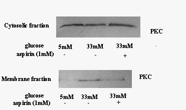 Se stie din literatura ca protein kinaza C (PKC) este activata in diabet, si ca PKC activata duce la producerea de anioni superoxizi prin activarea NADPH oxidazei. Pentru a demonstra ca aspirina scade activarea NADPH oxidazei actionand asupra PKC, am urmarit efectul aspirinei asupra acestei proteine, in conditii de glucoza crescuta prin Western Blot. Rezultatele arata ca in conditii normale, PKC este in majoritate localizata in fractia citosolica (figura 8). Concentratia mare de glucoza induce translocarea PKC din citosol in membrana ceea ce este echivalent cu activarea PKC. Tratarea celulelor expuse la glucoza crescuta cu aspirina reduce translocarea PKC in fractia membranara, demonstrand ca aspirina inhiba activarea PKC.