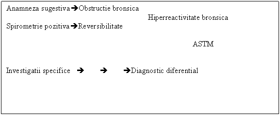 Evidentierea prin spirometrie a obstructiei bronsice si a caracterului (partial) reversibil al acesteia nu este patognomonica pentru astmul bronsic. Parcurgerea primelor 2 etape din algoritmul diagnostic: simptome compatibilespirometrie pozitiva, demonstreaza doar obstructie bronsica hiperreactivitate bronsica. Pentru a stabili diagnosticul de astm, trebuiesc eliminate alte cauze de hiperreactivitate bronsica.