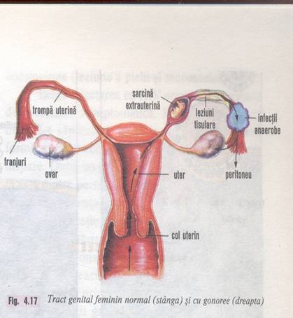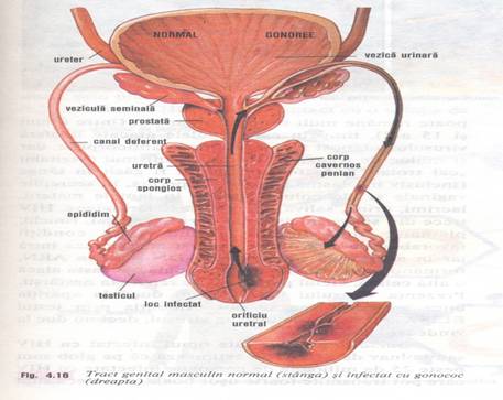 Tract genital masculin normal (stanga) si infectat cu gonococ(dreapta).