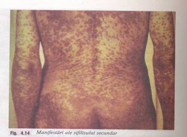 Sifilisul secundar se manifesta printr-o eruptie rosie pe corp ce apare intre doua si sase luni de la contactul infectant. Are simptome asemanatoare celei de gripa: febra, dureri de cap, dureri de gat.