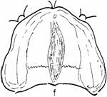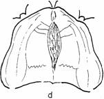 Fig. 5-4. Pozitia torusului palatinal; a - alungit; b, c- posterior extins; d - antero-median voluminos; e - anterior ingust; f - antero-posterior extins.