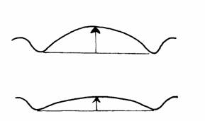 cu arcada dentara in forma literei V sau in omega; aceasta forma este favorabila pentru stabilitate a protezei (se opune tendintei de deplasare in sens orizontal); 2 - bolta palatina plata (orizontala) rezulta la pacientii care au suferit de parodontopatie cronica progresiva, aceasta forma favorizeaza crearea fortei de adeziune; 3 - bolta cu aspect intermediar o intalnim la pacientii care si-au extras dintii in urma complicatiilor produse de cariile netratate si reprezinta forma cea mai favorabila pentru restaurarea protetica; efectul este mai accentuat daca se asociaza cu o suprafata mare (fig. 5-5).
