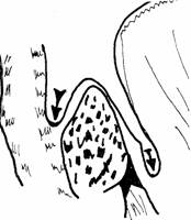 - Zona de mucoasa neutra este situata la periferia campului protetic, dincolo de limitele suprafetei acoperite cu mucoasa fixa. Mucoasa neutra se afla in apropierea funduri lor de sac. Aceasta zona de mucoasa se poate asemana cu o bandeleta lata de 2-3 mm, care inconjoara toata suprafata de mucoasa fixa (fig. 5-7). Mucoasa neutra este prezenta si la limita dintre palatul dur si palatul moale, denumita zona Ah (fig. 5-8). Zona de mucoasa neutra, sau pasiv mobila, daca este mai lata si situata mai aproape de fundul de sac, constituie un element morfologic deosebit de valoros pentru mentinerea protezei, deoarece intervine favorabil in formarea fenomenului de succiune.