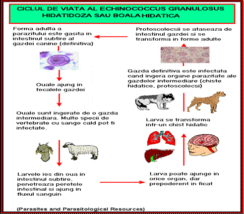 l Forma adulta din intestinul subtire al gazdelor definitive este un vierme plat ce masoara aprox. 3-5 mm, lipsit de cavitate generala si tub digestiv, ce se hraneste prin cuticula. Morfologic este constituit dintr-un cap (scolex), gat, care se continua cu corpul (strobila).