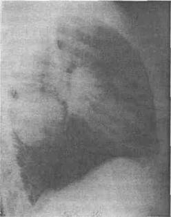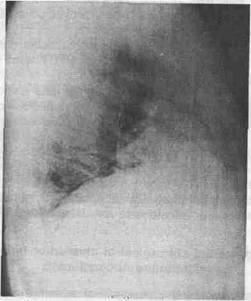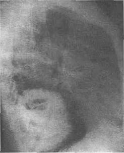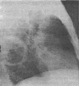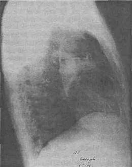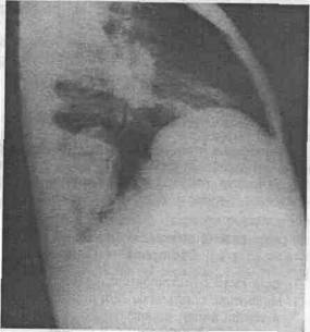 Fig. 9 - Radiografie pulmonara profil drept - tumora lob inferior drept abcedat.