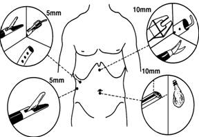 La majoritatea bolnavilor sunt necesare trei trocare accesorii. Trocarul operator de 10 mm este utilizat pentru introducerea pensei port-clip si a instrumentelor mai subtiri prin intermediul unui reductor adaptat la instrument.
