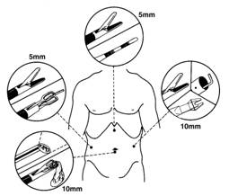 Exista numeroase alte variante ale pozitionarii trocarelor. Scoala franceza prefera dispozitia in romb a trocarelor accesorii (Fig. 7).