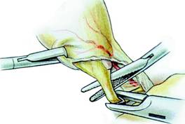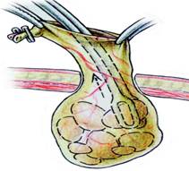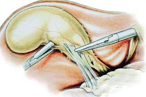 Fig. 17 - Extragerea calculilor veziculari cu o pensa de calculi dintr-o vezicula adusa la perete