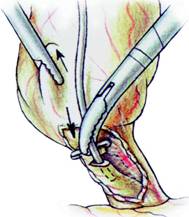 Disectia se face cu crosetul sau cu foarfecele. Artera trebuie separata de patul hepatic si disecata pe cel putin 1 cm in vecinatatea coletului vezicular. Se aplica 2 clipuri de Titan, dupa completa degajare a arterei si se sectioneaza cu foarfecele sau cu crosetul coagulator (Fig. 15). Uneori, se descopera si se ligatureaza numai ramura anterioara a arterei cistice, cea posterioara, nerecunoscuta, fiind lezata in timpul disectiei veziculei din pat.