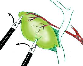 Fig. 8 - Prinderea fundusului vezicular cu o pensa atraumatica ce ridica ficatul si expune loja subhepatica