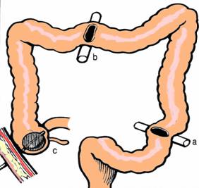 Fig. 1 Colostomii laterale: a. colostomie iliaca stanga; b. colostomie transversa; c. cecostomie (1)
