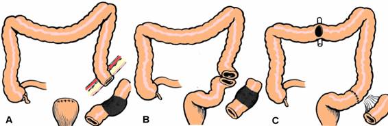 Fig. 2 - Colostomii asociate unei rezectii colice: A. Colostomie terminala in operatia Hartmann; B. Colectomie segmentara cu dubla colostomie terminala in teava de pusca (operatia Volkmann); C. Colostomie transversa laterala de protectie dupa colectomie sigmoidiana segmentara, cu stabilirea intr-un singur timp a continuitatii digestive (1)