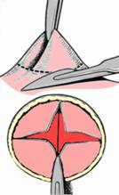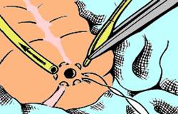 Reperarea orificiului de stomie se realizeaza inaintea operatiei, la distanta de reliefurile osoase, de ombilic, de cicatrici sau pliuri cutanate, pe linia spino-ombilicala, intern de marginea laterala a dreptului abdominal (Fig. 4). Cu o pensa se apuca punctul reperat (orificiul cutanat al viitoarei stomii), delimitand un con cutanat, a carui baza se sectioneaza cu bisturiul tinut orizontal (Fig. 4). Se sectioneaza tesutul celular subcutanat si, ajungand la foita anterioara a tecii dreptului, se practica o incizie cruciforma (Fig. 5) urmata de disocierea in sens vertical a fibrelor musculare; cu doua departatoare Farabeuf se indeparteaza fibrele musculare si se pun in evidenta fascia transversalis si peritoneul, care, la randul lor, vor fi sectionate.