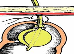 Se realizeaza o mica bursa, de preferat pe tenie, cu diametrul mai mare decat calibrul sondei. Cu bisturiul clasic, se practica o mica incizie in mijlocul bursei, prin care se introduce extremitatea sondei Foley cu ajutorul pensei de disectie. Se umfla balonasul si se strange firul de bursa. Se realizeaza o a doua bursa, la 2 mm in afara primei, care se strange si firul sau se trece prin peritoneu. Se retrage usor sonda, gest care aduce cecul la perete. Sonda va fi fixata la piele.
