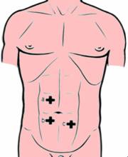 Fig. 9 - Amplasarea trocarelor in colostomia laparoscopica (6)