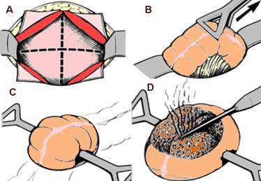 Fig. 3 - Cecostomia in cursul unei laparotomii: A. Trecerea sondei Foley dinafara inauntru, transparietal; B. Confectionarea bursei si deschiderea cecului pe tenie; C. Introducerea sondei Foley in cec si strangerea bursei; D. Umflarea balonasului si realizarea unei a doua burse in jurul sondei (1)