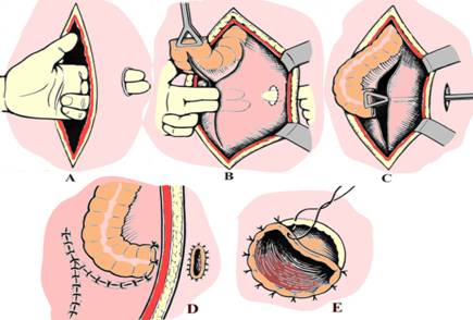 Fig. 6 - Colostomie terminala iliaca stanga, cu tunelizare: A. Prepararea bresei parietale care lasa sa treaca doua degete; B. Prepararea tunelului subperitoneal; C. Exteriorizarea capatului colic proximal; D. Peritonizare; E. Sutura muco-subcutanata a colonului sectionat la perete (1)