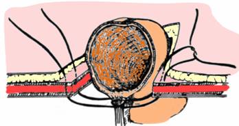 Cu ajutorul a 8-10 fire lent resorbabile se realizeaza o sutura intre submucoasa colica si tesutul subcutanat (Fig. 6), eversand usor colonul si realizand o stomie in relief de 1-2 mm. Pentru a evita infectiile locale se prefera strangerea acestor fire dupa 24-48 de ore, interval in care, in jurul capatului colic, se pun mese cu iodoform. Cand se deschide stomia, se va face un tuseu pentru a verifica permeabilitatea sa si se ataseaza o punga transparenta de colostomie pentru a controla viabilitatea colonului.