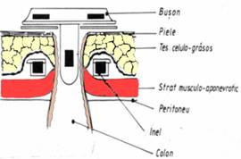 colostomia se realizeaza trecand prin teaca dreptului, pentru a preveni eventratiile peristomale;