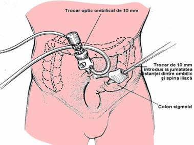 Bolnavul este asezat in decubit dorsal. Tegumentele se dezinfecteaza si se plaseaza cimpuri sterile adezive. Se instaleaza o sonda nazogastrica si una urinara. Se instituie pneumoperitoneul si se introduce trocarul optic subombilical. Se mai introduce un trocar de 10 mm in fosa iliaca stanga, pe locul unde, preoperator, s-a marcat pozitia colostomiei; cel mai adesea, aceasta se gaseste la mijlocul distantei spino-ombilicale (Fig. 9).