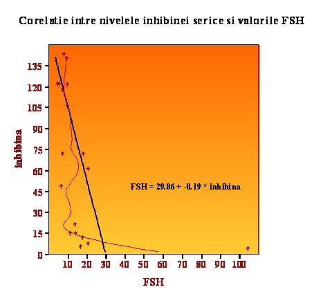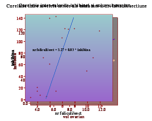 Valorile inhibinei serice s-au corelat negativ puternic atat cu valorile FSH din ziua a 3-a a ciclului (coeficient corelatie = -0,706, p<0,001), cat si cu volumul ovarian (r = 0,507, p = 0,032) si cu numarul de foliculi/sectiune (r = 0,576, p = 0,16).