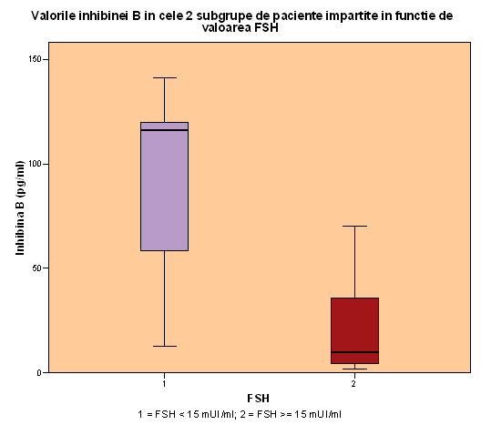 Valorile inhibinei B au fost semnificativ (p< 0,01) mai mari in cazul pacientelor cu valori ale FSH mai mici de 15 mUI/ml (inhibina B = 91,5 46,5 pg/ml) - cut-off-ul utilizat pentru selectia pacientelor eligibile pentru programele de FIV decat in cazul pacientelor cu FSH ≥ 15 mUI/ml (inhibina B in acest grup = 23,3 28,6 pg/ml)