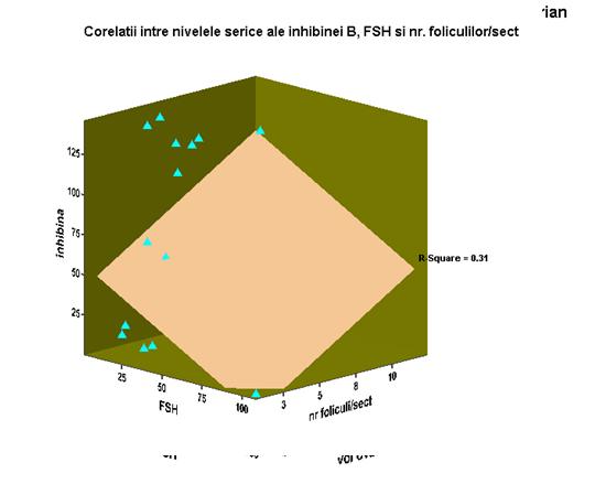 Nu am identificat un model de regresie liniara la fel de semnificativ atunci cand am analizat influenta comuna a FSH si volumului ovarian, respectiv a FSH si numarului de foliculi/sectiune asupra valorilor inhibinei B - aceasta datorita dependentei puternice a valorilor inhibinei de concentratia serica a FSH - valorile mari ale inhibinei au corespuns unor valori normale ale FSH, dar unei largi distributii a volumului ovarian sau a numarului de foliculi/sectiune - fig10,11.