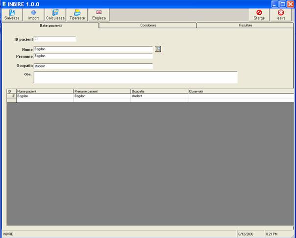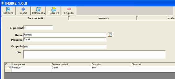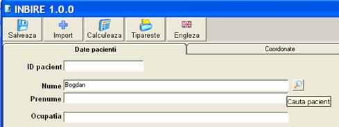 Modulul Form al programului denumit INBIRE este prezentat in figura 17. Controalele TextBox cu etichetele ID pacient/ID Patient, Nume/Name, Prenume/Surname, Ocupatia/Profession permit identificarea unei linii deja existente in baza de date sau introducerea unei linii noi, pentru un pacient neinregistrat in baza.
