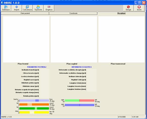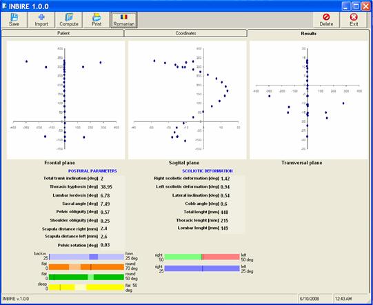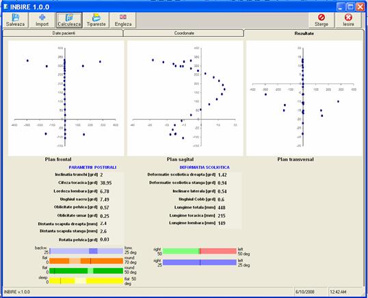 Tab - ul Rezultate/Results contine controalele necesare afisarii numerice si grafice a parametrilor de caracterizare a coloanei vertebrale. Calculul si popularea controalelor sunt comandate prin butonul Calcul/Compute.
