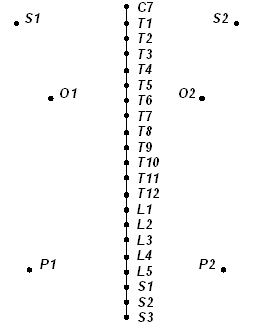 Lotul de subiecti a fost investigat cu echipamentul Inspeck si a rezultat un set de date primare, continand coordonatele 3D ale apofizelor vertebrale de la C7 pana la S3, la care s-au adaugat informatiile aditionale aferente scapulei, apofizelor iliace si apofizei proximale humerale. In figura 1 sunt prezentate cele 27 de puncte in care au fost aplicate marchere de prelevare a coordonatelor 3D.