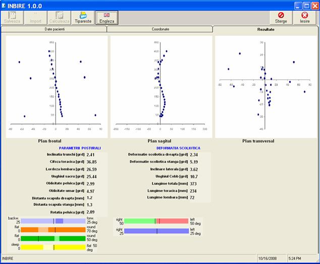 Fisierele de date ASCII create prin softul FAPS, cu care este dotat echipamentul Inspeck au fost exportate in MS Excel si stocate in baza de date MS Access, conectata la programul specializat INBIRE. Acesta este o aplicatie VBA, care permite determinarea numerica a unei serii de parametri caracteristici posturii. Pe langa valori numerice, programul ofera reprezentari grafice ale coloanei vertebrale in plan frontal, sagital si transversal si informatii aditionale intuitive sub forma unor scari cromatice, pe care sunt indicate si intervalele normale de cuprindere a parametrilor posturali. In figura 2 este prezenta o captura de ecran continand interfata grafica a programului in Tab-ul Rezultate, dupa rularea secventei de calcul pentru un anumit subiect.