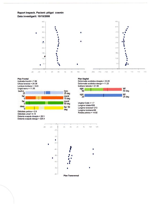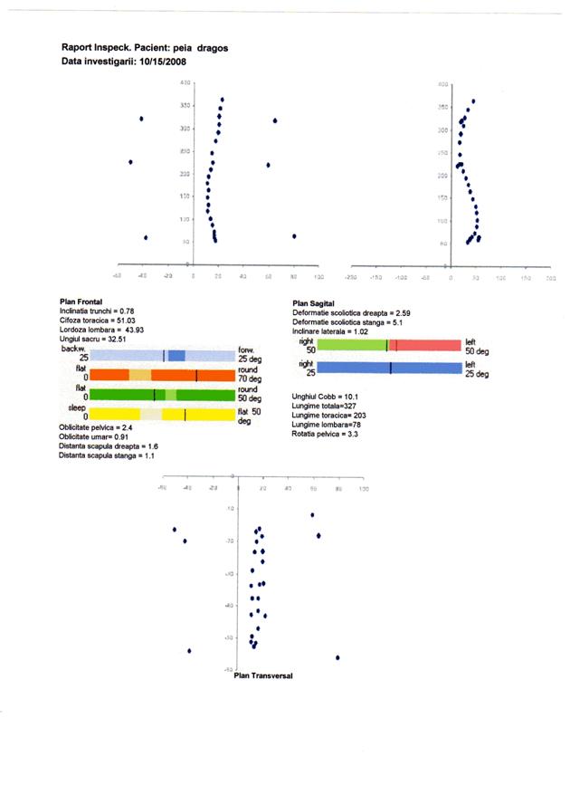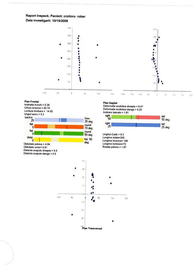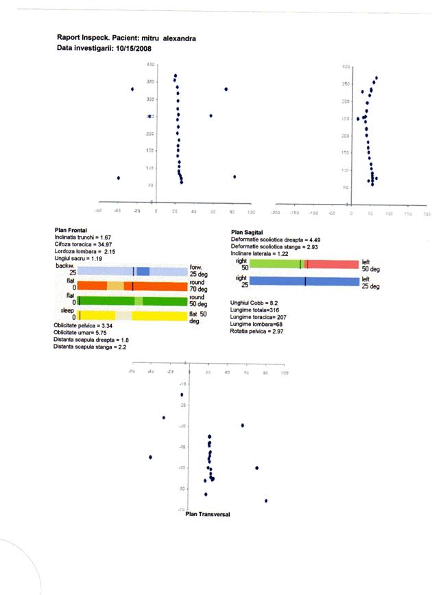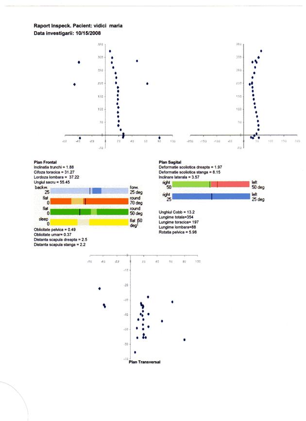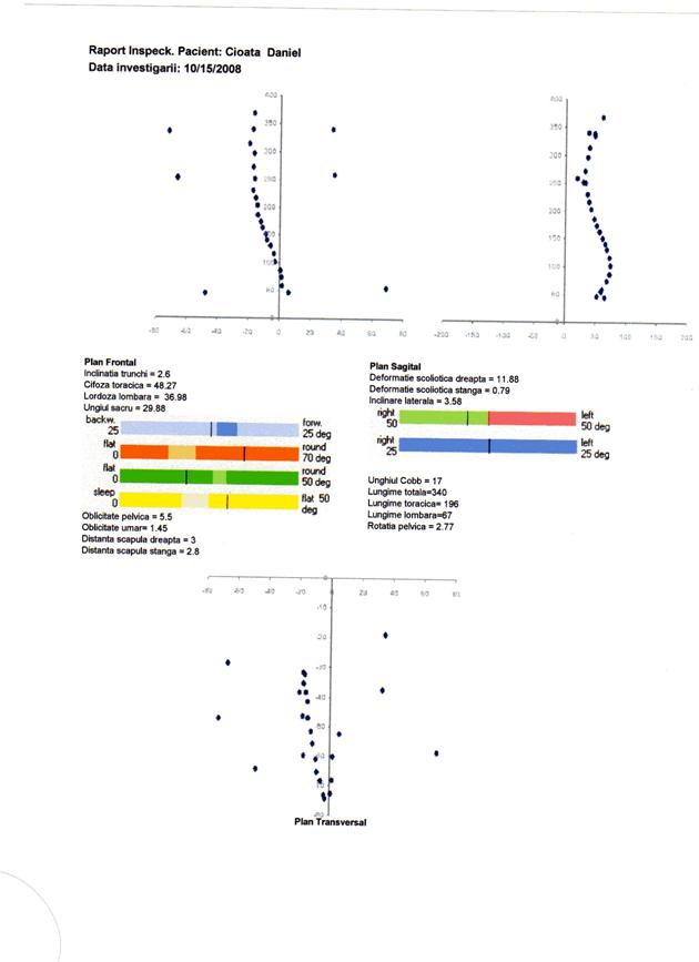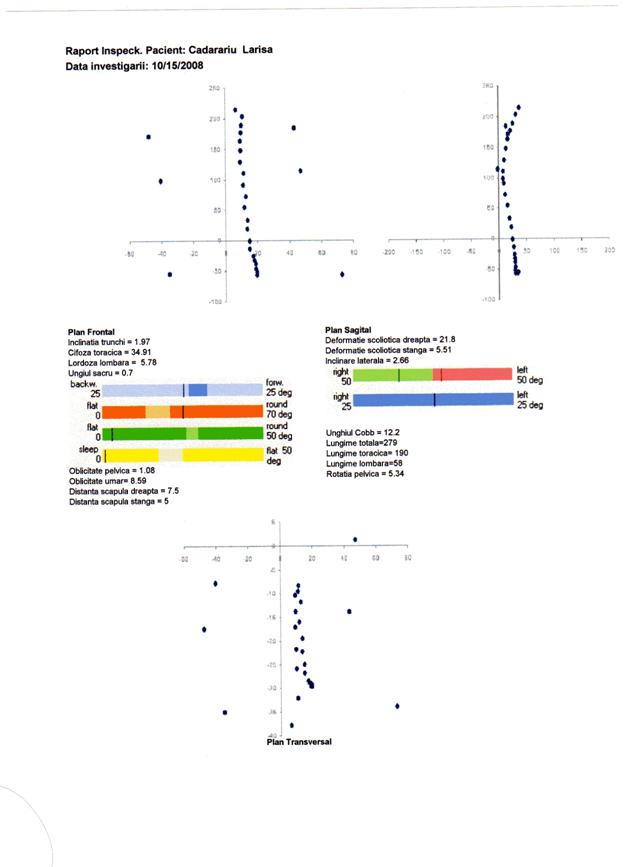 q scolioza severa, indicata prin valori ale unghiului Cobb peste 25 deg, distante scapulare peste 10 mm si inclinari laterale peste 5 deg, nu este prezenta. Totusi parametrii scoliotici la nivelul unor segmente ale coloanei pune in evidenta deformatii scoliotice destul de semnificative atat la nivel toracic, cat si lombar