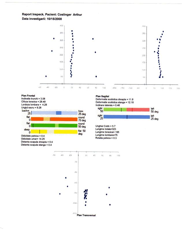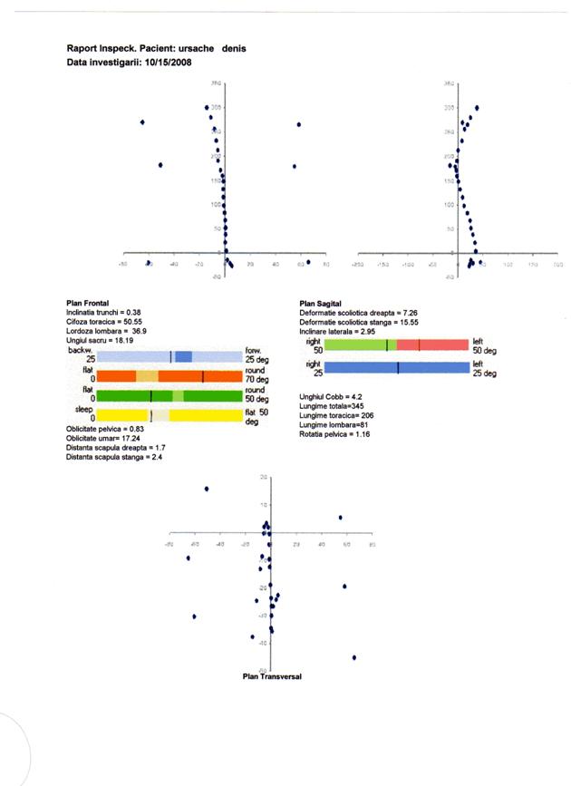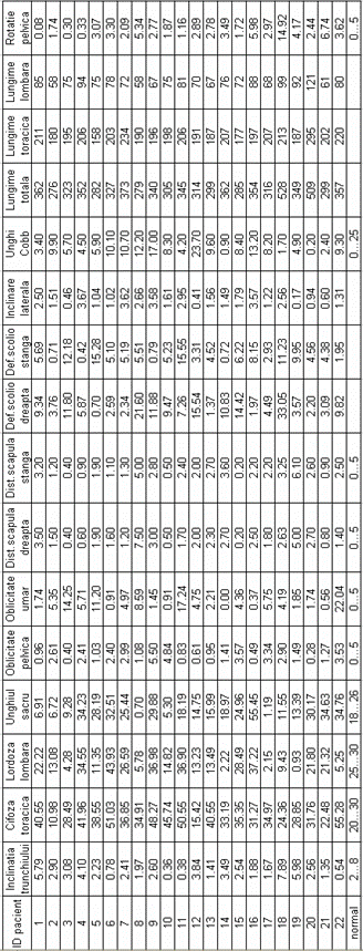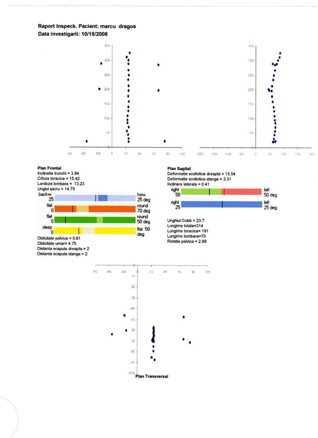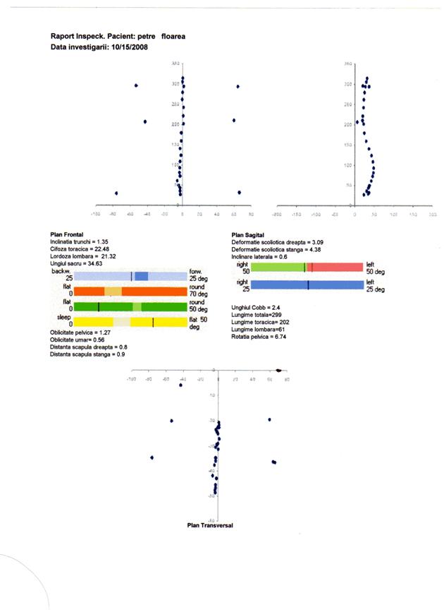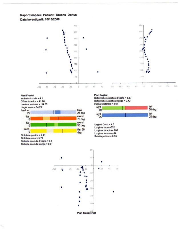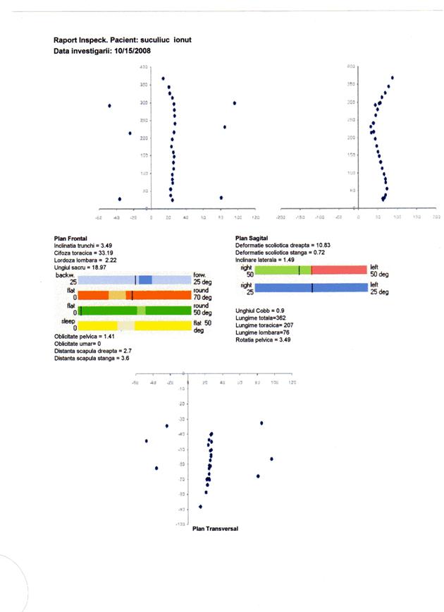 q scolioza severa, indicata prin valori ale unghiului Cobb peste 25 deg, distante scapulare peste 10 mm si inclinari laterale peste 5 deg, nu este prezenta. Totusi parametrii scoliotici la nivelul unor segmente ale coloanei pune in evidenta deformatii scoliotice destul de semnificative atat la nivel toracic, cat si lombar