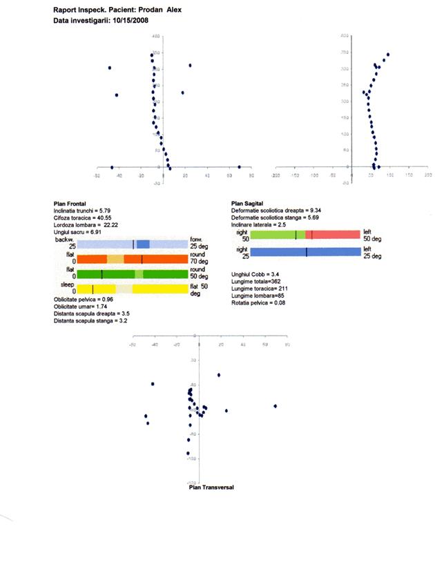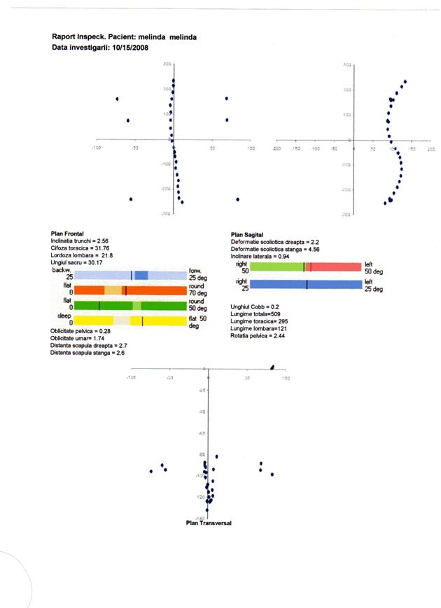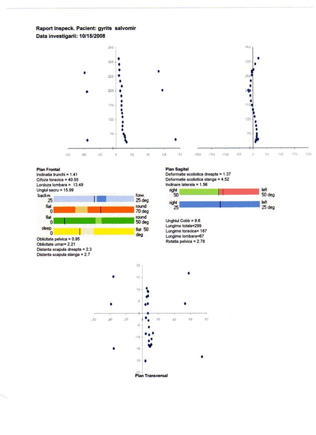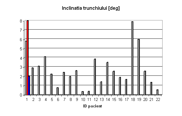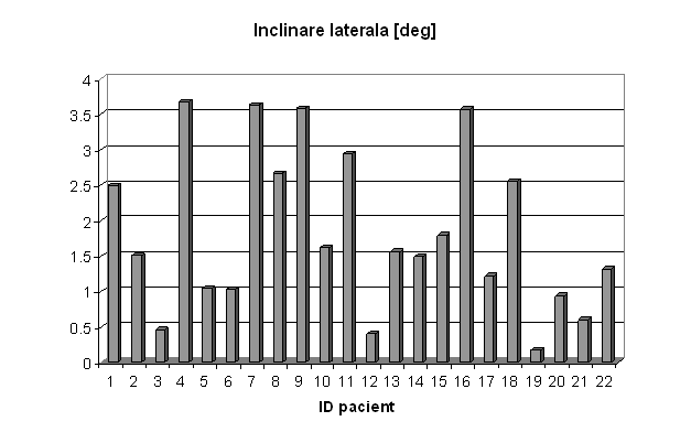 q inclinarea laterala, desi este prezenta in toate cazurile de scolioza, poate avea valori nenule si in absenta acesteia. Reprezentarile grafice din anexe indica pentru majoritatea subiectilor o inclinare spre stanga, explicabila prin postura incorecta in banca sau la birou, practicata in mod curent