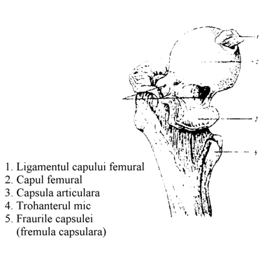 Capsula articulara este intarita inainte, inauntru si inapoi prin trei benzi ligamentare cunoscute sub numele de: ligamentul ilio-femural, pubo-femural; ischio- femural.