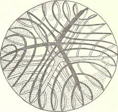 Pe masura ce iau nastere, fibrele se dispun in straturi concentrice. Cele centrale, primele aparute, au o directie anteroposterioara. Celelalte descriu traiecte arcuite, din ce in ce mai complexe, pe masura ce ne apropiem de capsula. Extremitatile lor se intilnesc si, fiind unite de substanta cimentara, interfibrilara, dau nastere unor formatiuni liniare, care reprezinta zonele de insertie a fibri-lelor. Ele se numesc razele cristalinului (radii lentis) si din unirea lor rezulta formatiuni stelate, cu mijlocul pe axul cristalinului. Fibrilele portiunii centrale a cristalinului, care s-a format in cursul vietii intrauterine si in prima copilarie, se desprind de pe doua stele cu cite (trei raze, in forma de Y (fig. 558). Steaua anterioara reprezinta un Y in picioare, iar cea posterioara - un Y rasturnat, deci ele sint rotate cu 180 una fata de alta, iar razele stelelor formeaza intre ele unghiuri de 60. Cu virsta, stelele din straturile mai superficiale sint mai complexe, prezentind raze mai numeroase, 6-10. Fibrele pleaca de pe bratul uneia din stele, anterioara sau posterioara, din stratul respectiv, descriu un traiect arcuat, trecind peste ecuator, si se insera pe un brat apropiat al stelei opuse. Gratie acestei dispozitii, fibrele au lungimi aproximativ identice.