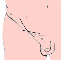 O incizie oblica, de la mijlocul segmentului dintre spina iliaca anterosuperioara si orificiul intern al canalului inghinal pana la spina pubisului, ofera un acces bun.