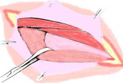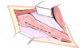 Un artificiu operator care permite, deseori, o relaxare considerabila a tendonului conjunct si permite sutura acestuia fara tensiune il constituie incizia de relaxare a tecii dreptului imaginata de Halsted (2).