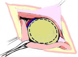 una din conditiile esentiale pentru eficacitatea tehnicii este o buna etalare a plasei care este, in aceste conditii, mentinuta in pozitie functionala de presiunea fundului de sac peritoneal prevezical;