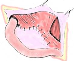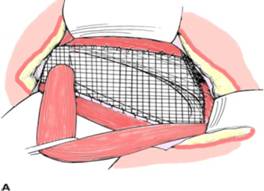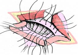 se foloseste o proteza neresorbabila, de preferinta din polipropilen (Fig. 18); in tehnica clasica a fost folosit initial Goretex-ul;