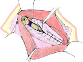Urmeaza incizia aponevrozei marelui oblic, pe toata lungimea plagii, in sensul fibrelor, deschizand orificiul inghinal superficial (Fig. 2). Cu o pensa de disectie se ridica marginea superioara a inciziei aponevrotice si se decoleaza usor fata sa profunda pentru a descoperi fibrele micului oblic si tendonul conjunct. Se ridica si buza inferioara, se decoleaza fata profunda a arcadei crurale si cea a bandeletei ilio-pubiene Thompson, care se pun in evidenta pana la simfiza pubiana. Se va proteja ramul pubian al marelui nerv abdomino-genital, ce va fi decolat de pe marele oblic, aflat sub lamboul superior si ramul inghinal al micului nerv abdomino-genital, aflat sub lamboul inferior.