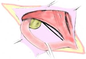 se sectioneaza succesiv planurile pana la aponevroza marelui oblic care se sectioneaza longitudinal; se trateaza sacul si continutul ca la cura oricarei hernii;