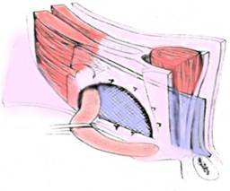 Fig. 17 - Procedeul Rives - plastie cu proteza fixata cu fire separate pe sectiune sagitala si transversala (4)