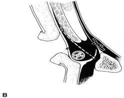Urmeaza disectia sacului herniar care poate fi: oblic extern, in afara vaselor epigastrice, cu traiect intrafunicular; direct, inauntru pediculului epigastric si in afara funiculului; dublu, oblic extern si direct, caz rar, care trebuie totusi cautat (Fig. 5).